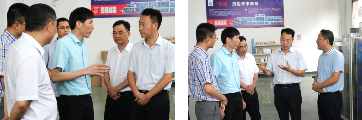 杨益服董事长向领导们介绍了我司最新设备“DTWHL-500高速泡罩枕包装盒双轨双用一体机”